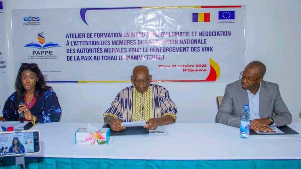 Dans le cadre du Projet d’Appui au Parlement et aux Processus Électoraux (PAPPE), le Centre Européen d’Appui Électoral (ECES) a officiellement clôturé l’atelier de formation en médiation, diplomatie et négociation à l’attention des membres de la Coalition Nationale des Autorités Morales pour le Renforcement des Voix de la Paix au Tchad (CONAMM).
