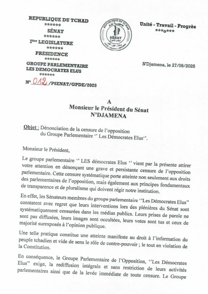 Dans une lettre ouverte adressée au président du Sénat Dr Haroun Kabadi, ce 30 septembre 2025, le groupe parlementaire «Les Démocrates Elus», dénonce une censure de l’opposition parlementaire. Cette censure systématique porte atteinte non seulement aux droits des parlementaires de l’opposition, mais également aux principes fondamentaux de transparence et de pluralisme qui doivent régir l’institution, dit le groupe.