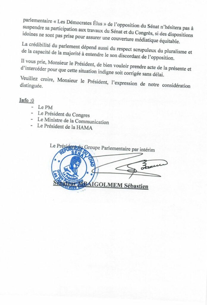 Le groupe parlementaire «Les Démocrates Élus» de l’opposition du Sénat relève qu’il n’hésitera pas à suspendre sa participation aux travaux du Sénat et du Congrès, si des dispositions idoines ne sont pas prise pour assurer une couverture médiatique équitable.