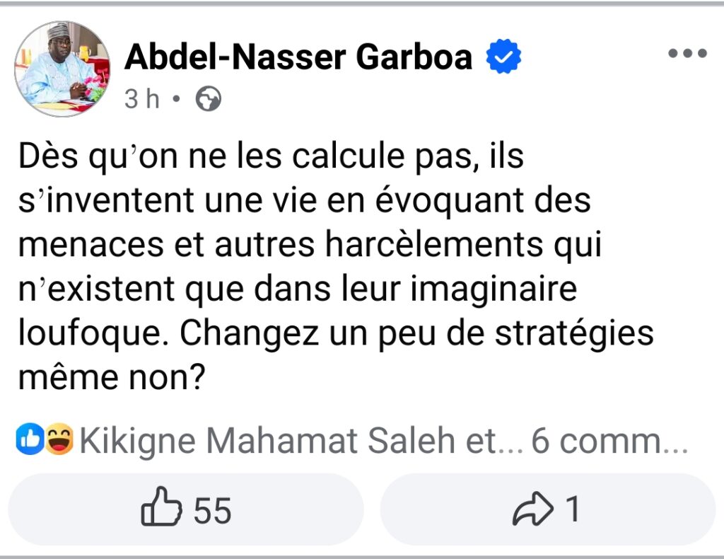 Le porte-parole du mouvement patriotique du salut (MPS), parti au pouvoir, Abdel-Nasser Garboa, a réagi à ces accusations sur sa page Facebook. « Dès qu’on ne les calcule pas, ils s’inventent une vie en évoquant des menaces et autres harcèlements qui n’existent que dans leur imaginaire loufoque. Changez un peu de stratégies même non ? »